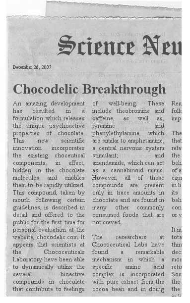 which has become the buzz of academic circles.  The Chococeuticals Laboratory is making available to the public their remarkable preparation which utilizes the hidden, almost trace, elements in chocolate in such a fashion that some are considering classifying this psychoactive as a new drug and limiting its distribution.